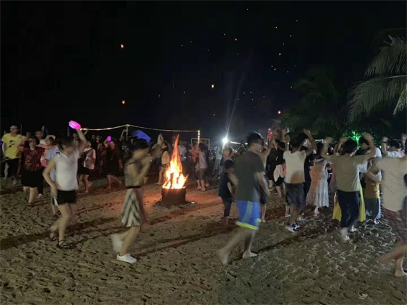夜幕降臨,大家都光著腳丫,踩在軟綿綿的沙灘上,圍著一團(tuán)團(tuán)的篝火,唱著歌,跳著舞......