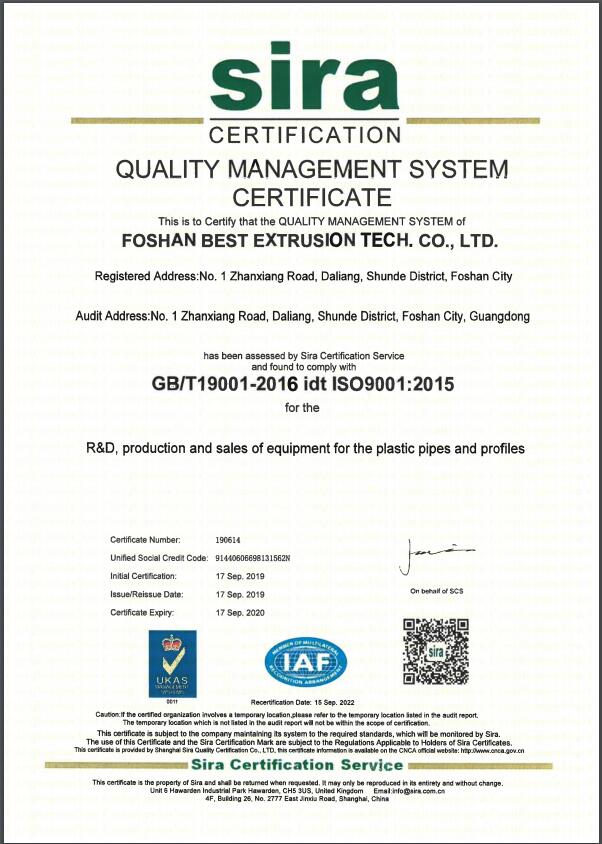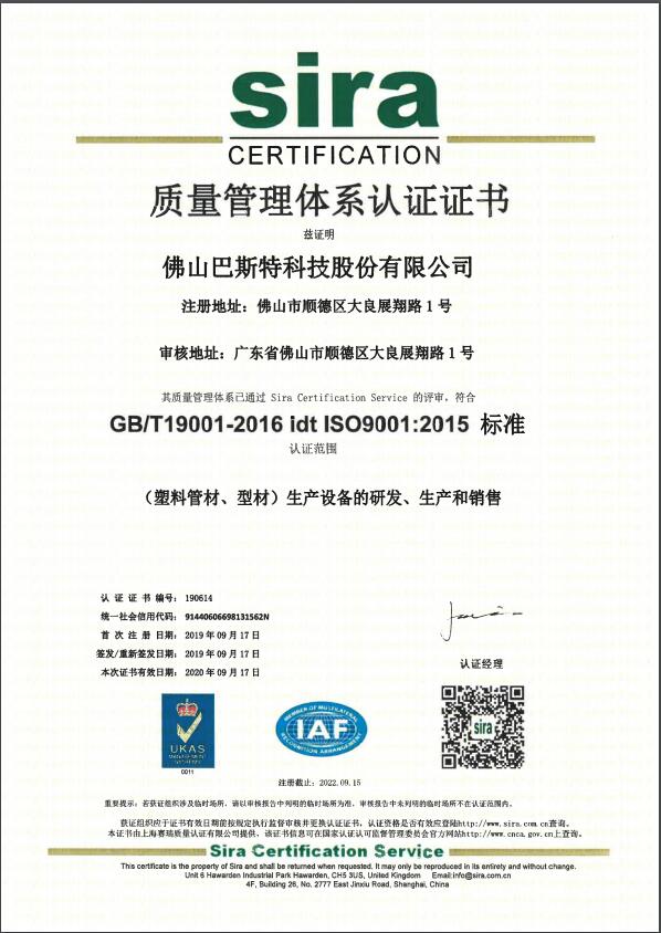 熱烈祝賀佛山巴斯特科技股份有限公司通過國(guó)家GB/T19001-2016 Idt ISO9001:2015標(biāo)準(zhǔn)質(zhì)量管理體系認(rèn)證!