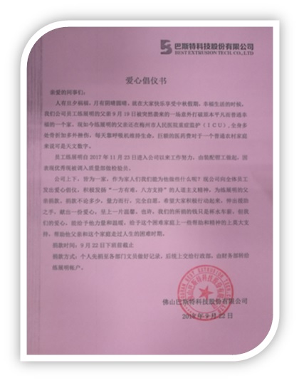 After hearing about the situation, the company management immediately advocated a charitable donation activity at the company's regular meeting, calling on all employees to carry forward the spirit of solidarity and friendship, lend a helping hand and actively donate. The company management firstly took the lead in giving up the donation, and all the employees responded. The employees who are on a business trip also entrusted colleagues to make donations. On September 22nd, all employees of the company raised a donation of RMB12456 for his father.